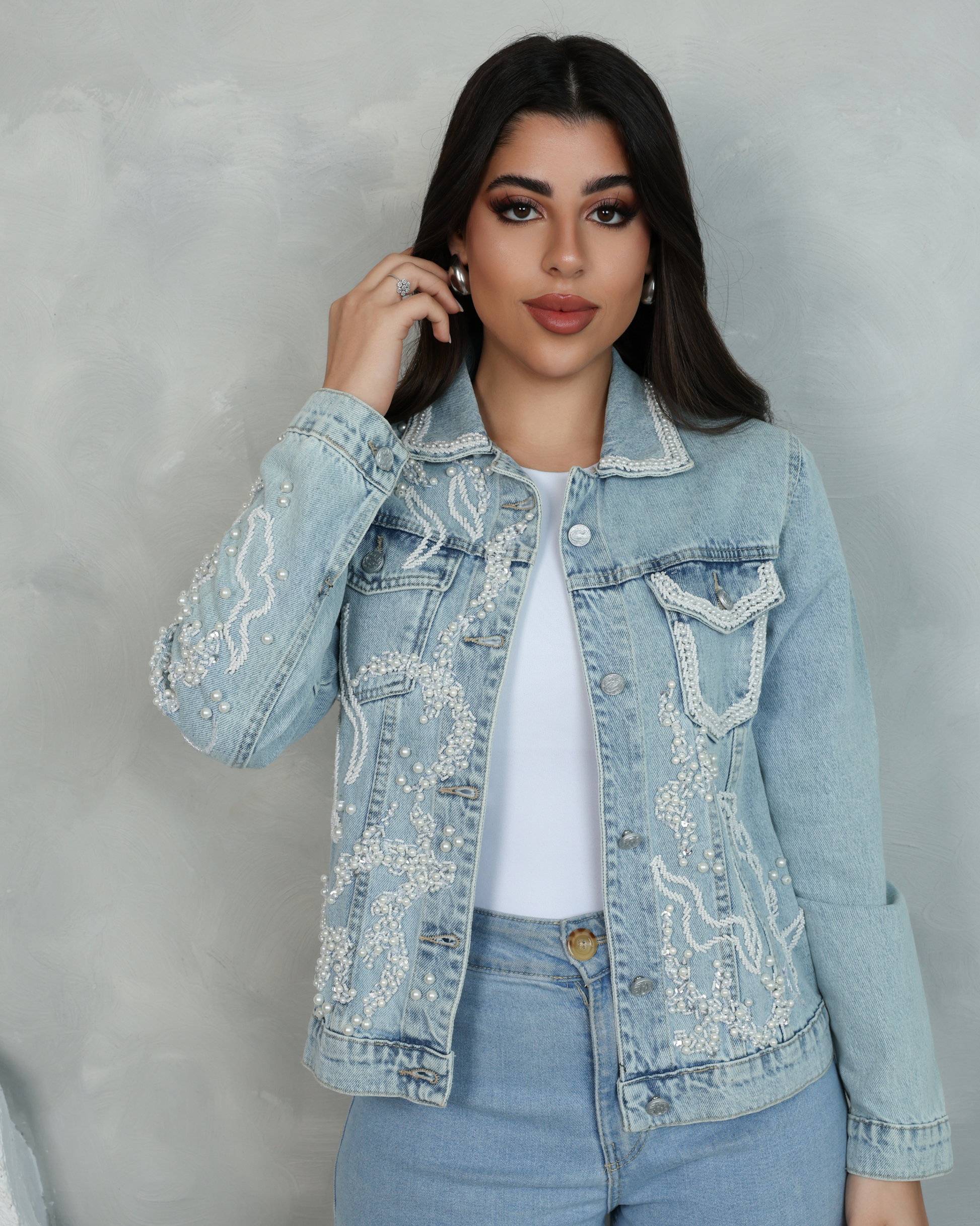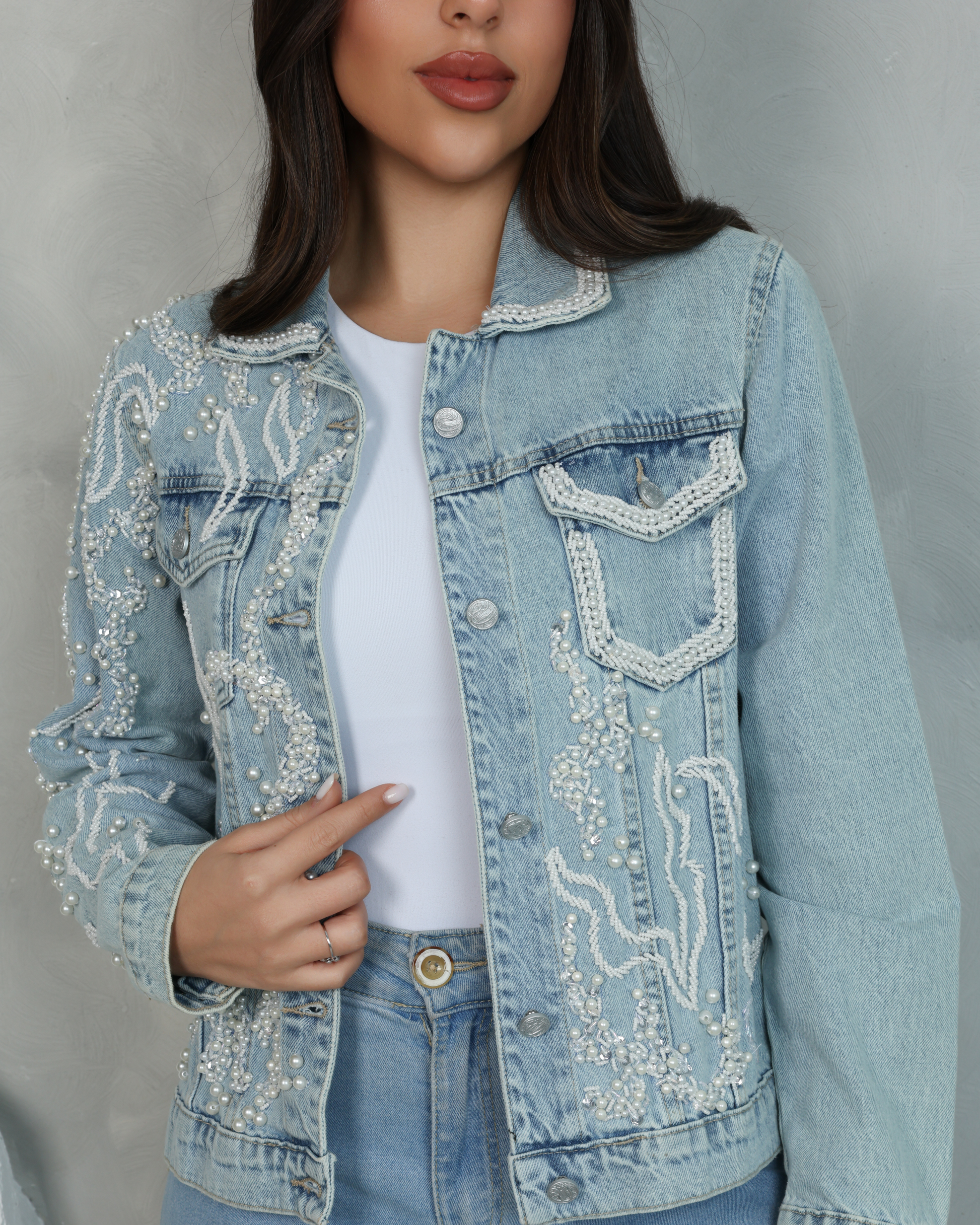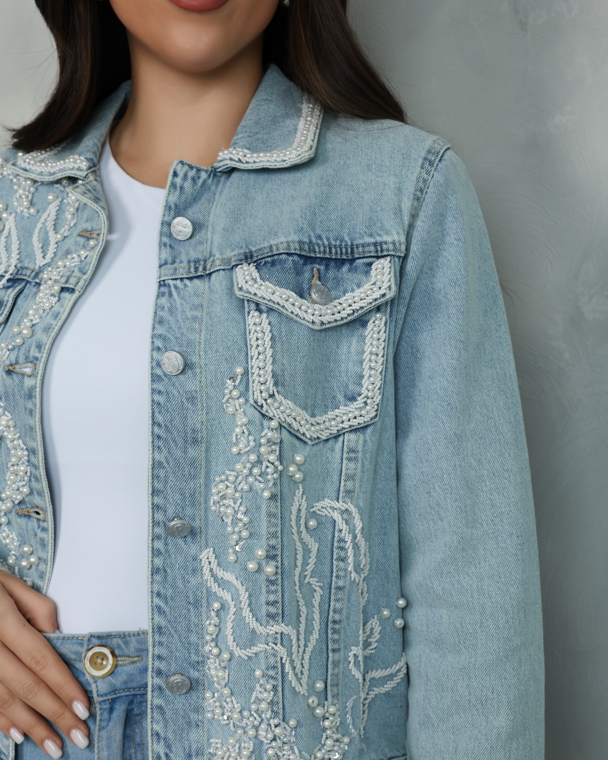ارتقِ بإطلالتك مع هذه الجاكيت الجينز المزين يدويًا بشكل فاخر. يتميز بتفاصيل دقيقة من اللآلئ والخرز في تصميم فني مميز وانسيابي، يجمع بين الأناقة العصرية والحرفية الكلاسيكية. مثالي للظهور بإطلالة ملفتة ومناسبة لجميع المناسبات. أضف لمسة من التميز والأناقة مع هذا التصميم الفريد من نوعه.