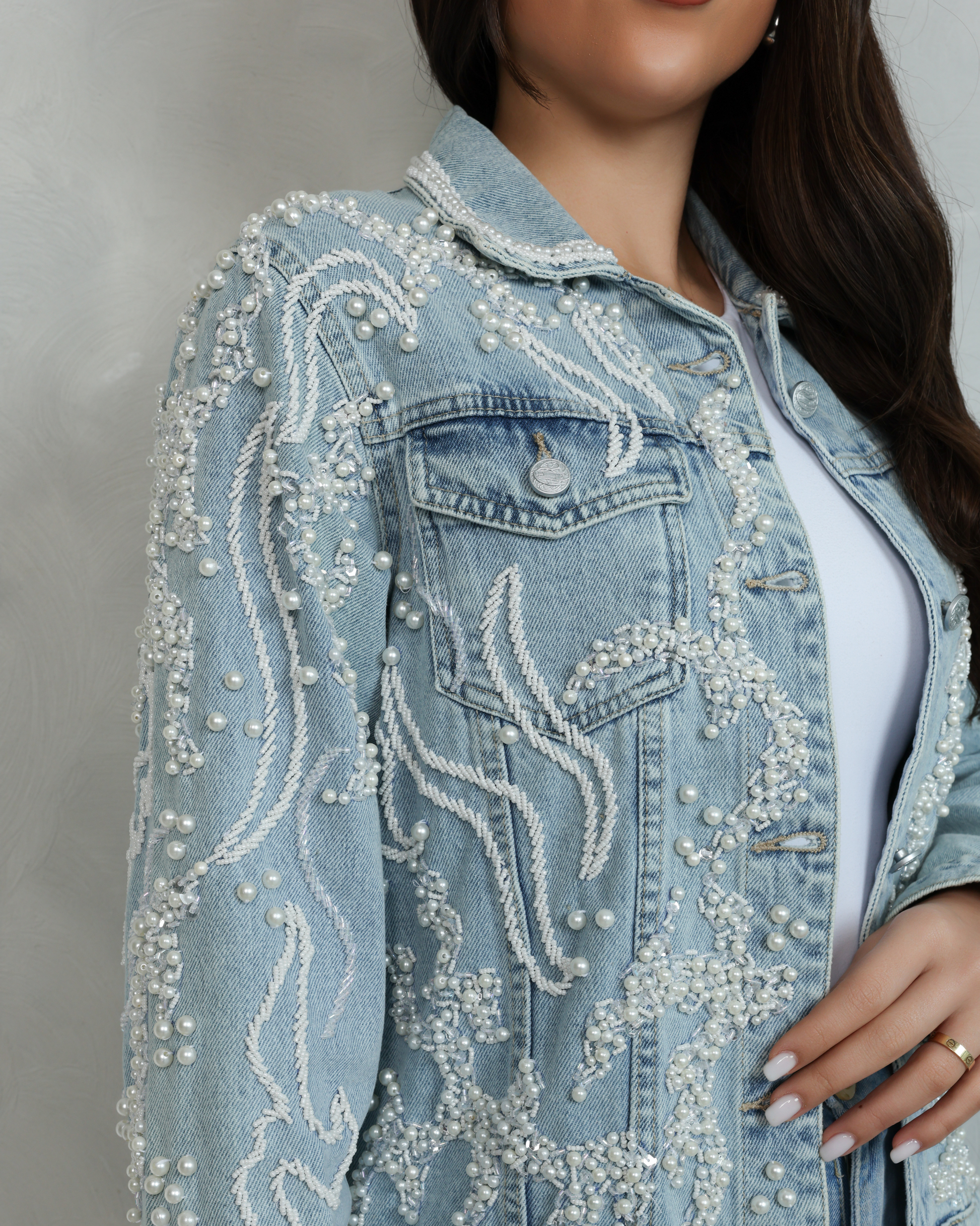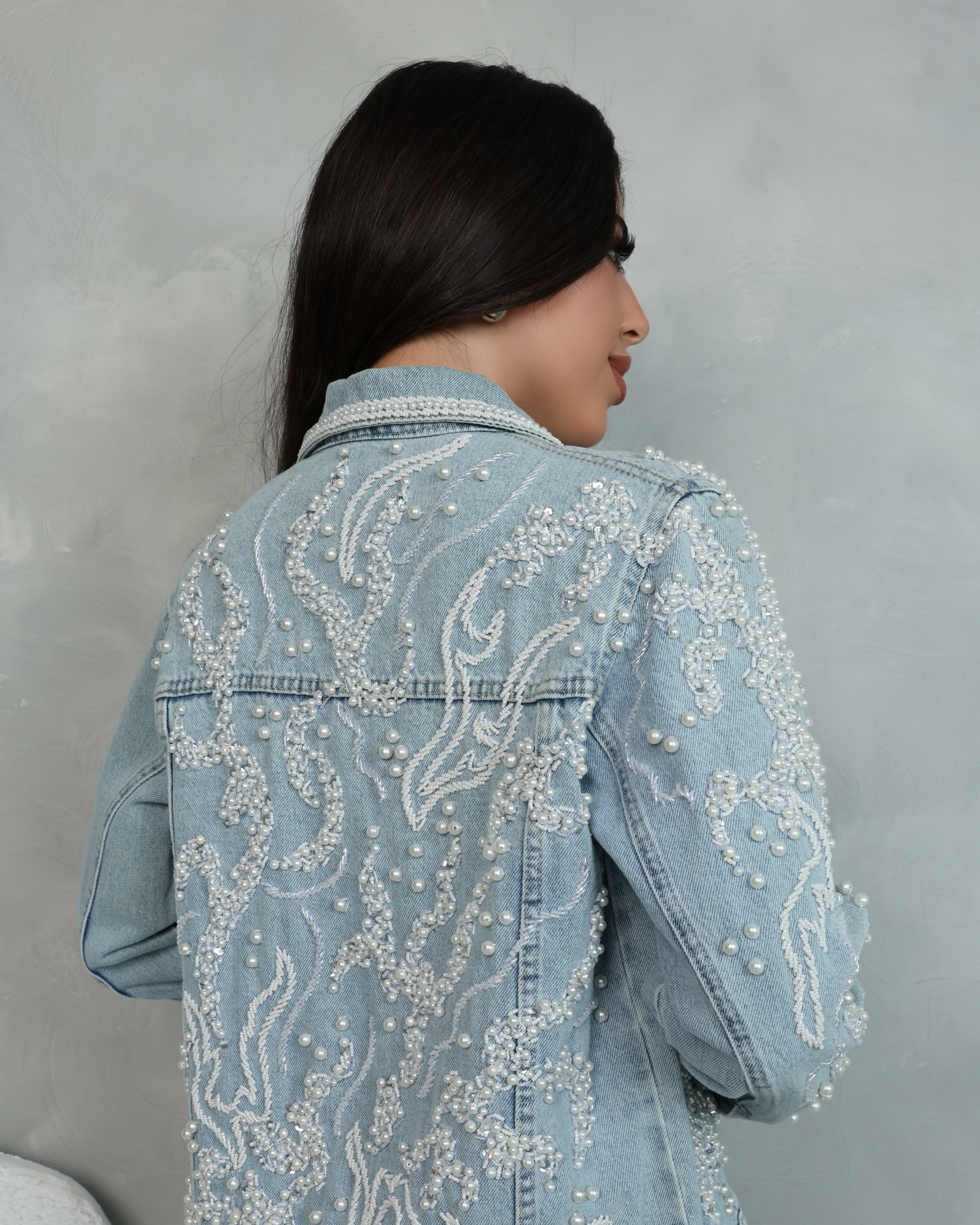Elevate your wardrobe with this exquisite hand-embellished denim jacket. Featuring intricate pearl and bead detailing in a flowing, artistic pattern, this jacket combines modern style with timeless craftsmanship. Perfect for making a statement, it’s a versatile piece for any occasion. Add a touch of elegance and individuality to your outfit with this one-of-a-kind design.