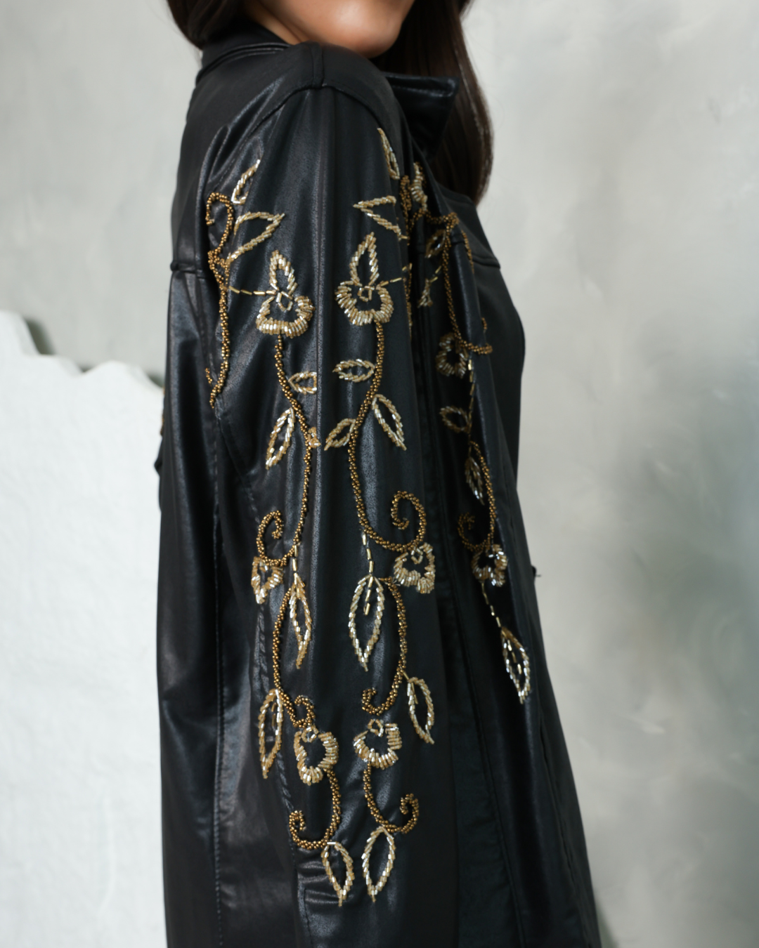 استمتعي بفخامة خالدة مع جاكيت "ليذر جولد"، مزيج رائع من الجلد الأسود الفاخر والتطريز الذهبي اليدوي. صُمم للمرأة العصرية التي تعكس الثقة والقوة، حيث يجمع هذا الجاكيت المطرز بعناية بين الأناقة الراقية والموضة الجريئة.
