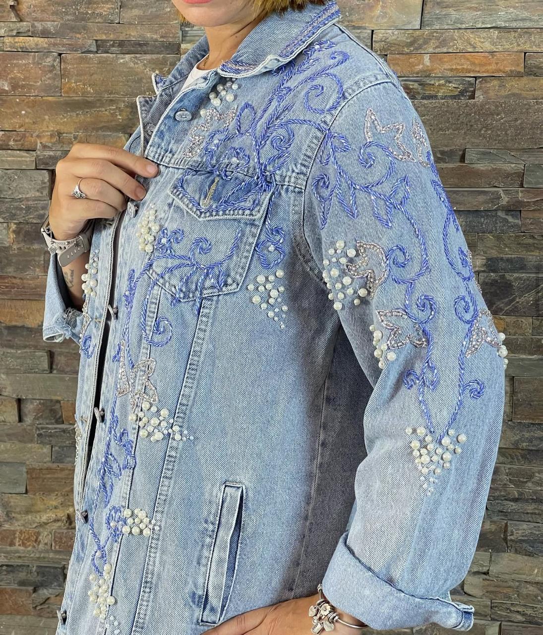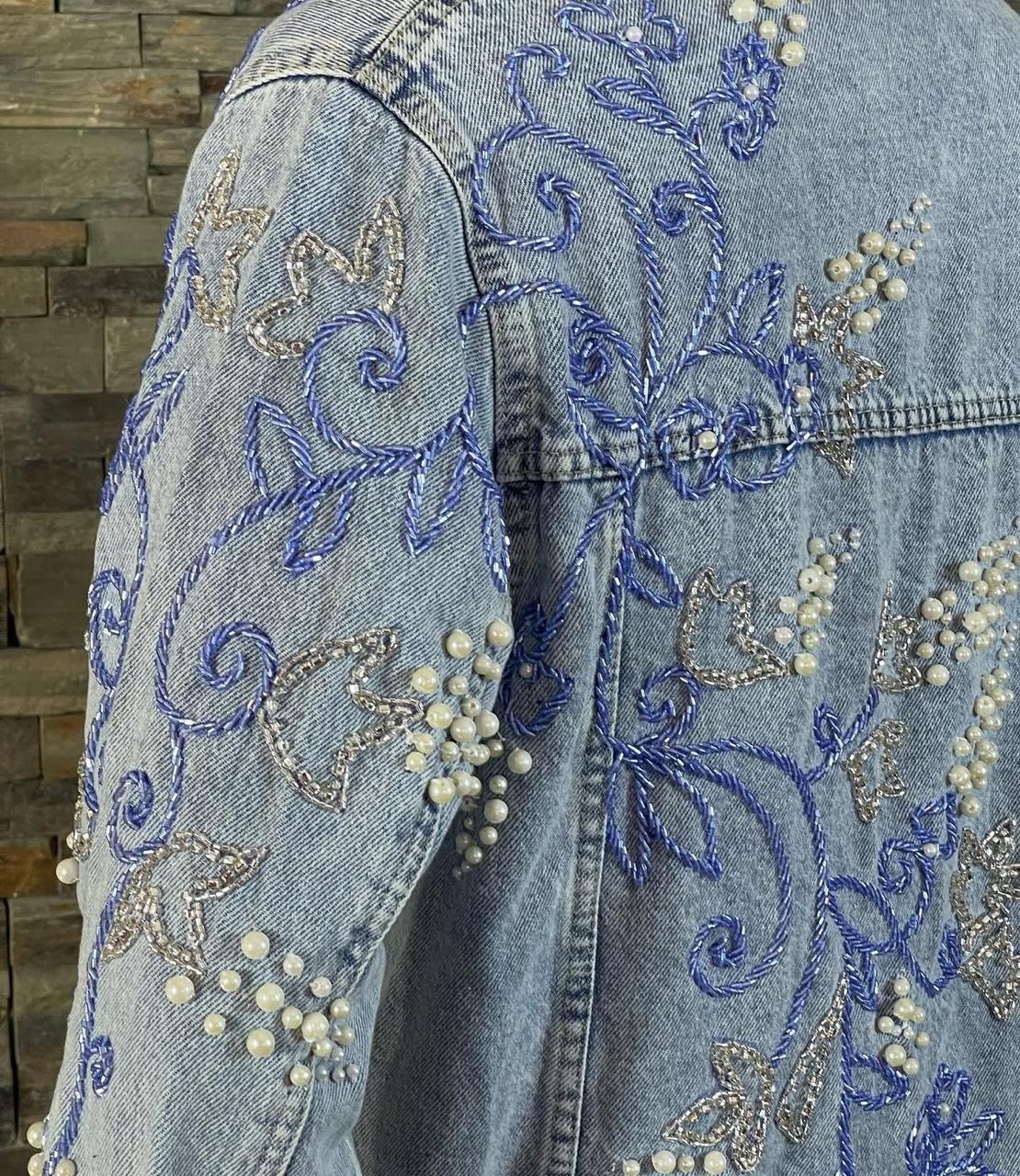Unveiling the Sara Jacket, a masterpiece of fashion that seamlessly blends luxury with intricate craftsmanship. Designed for the modern woman who values sophistication, this denim jacket features exquisite embroidery and pearl embellishments, adding a touch of grace to every outfit. With its timeless appeal and comfortable fit, Sara is more than just a jacket—it’s a statement of elegance.