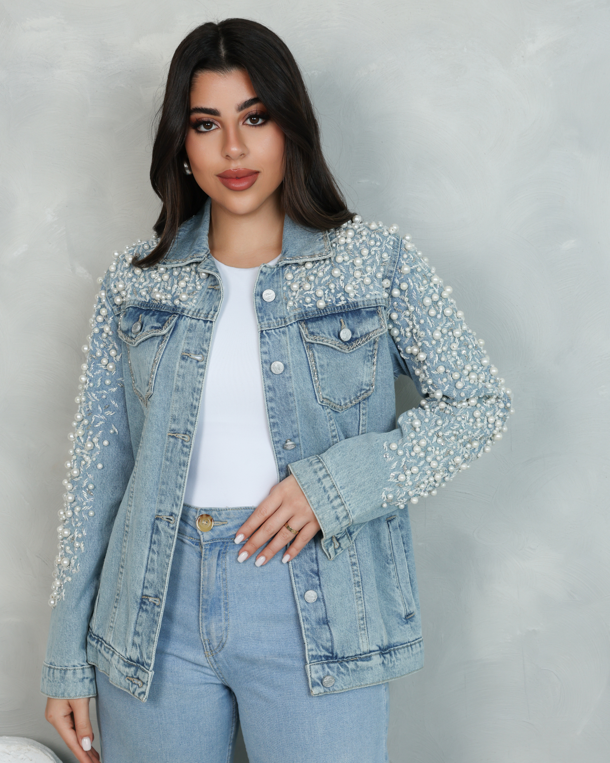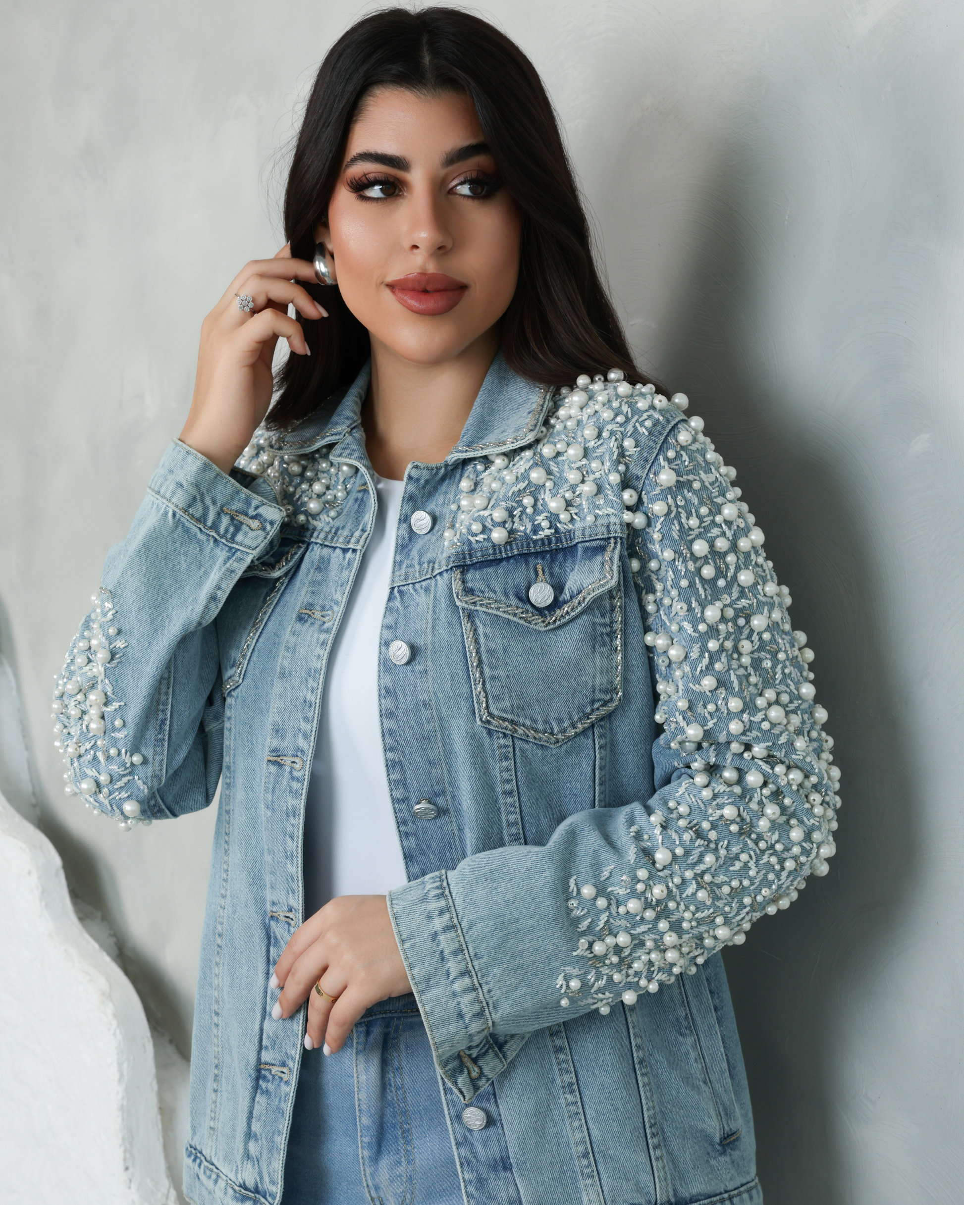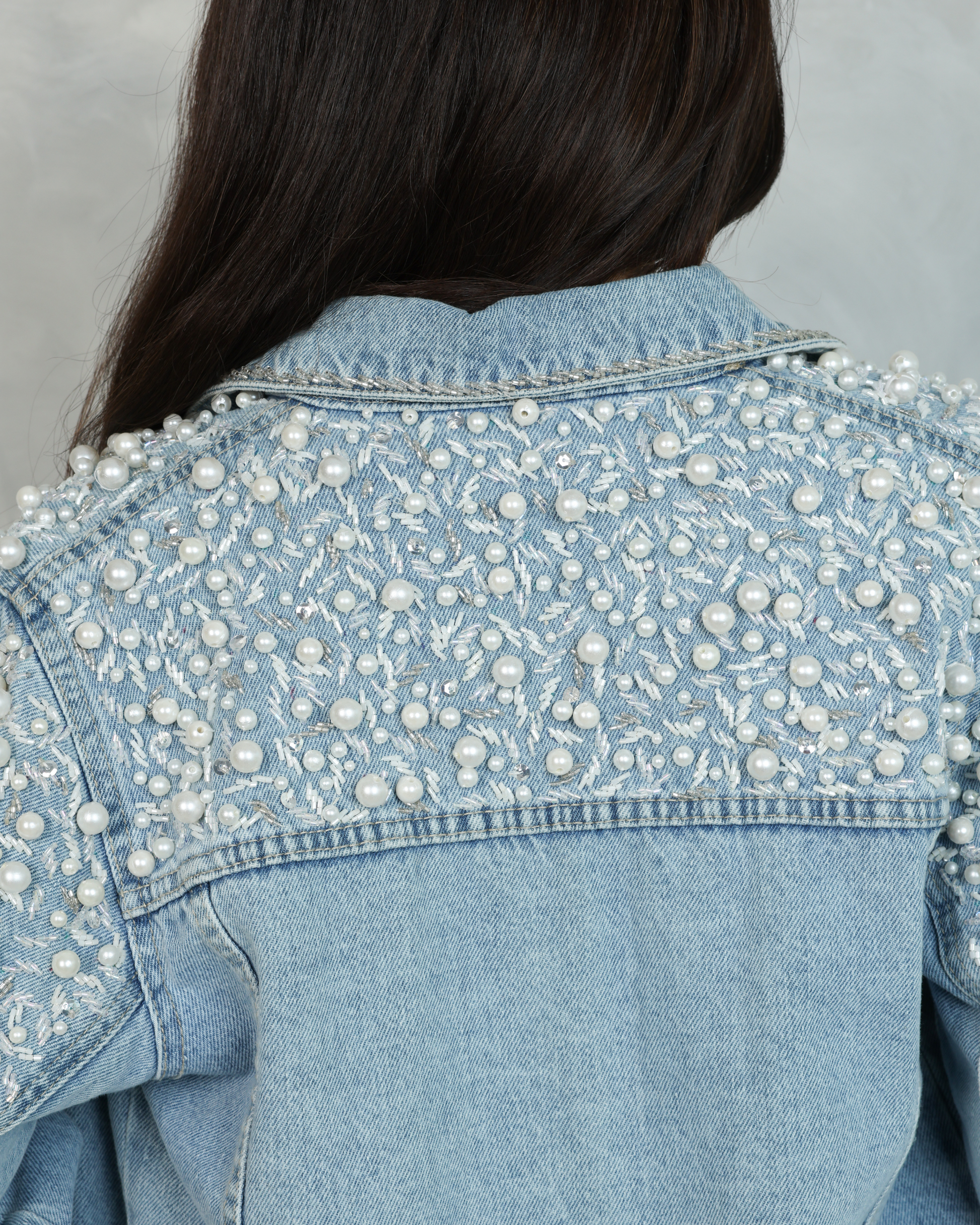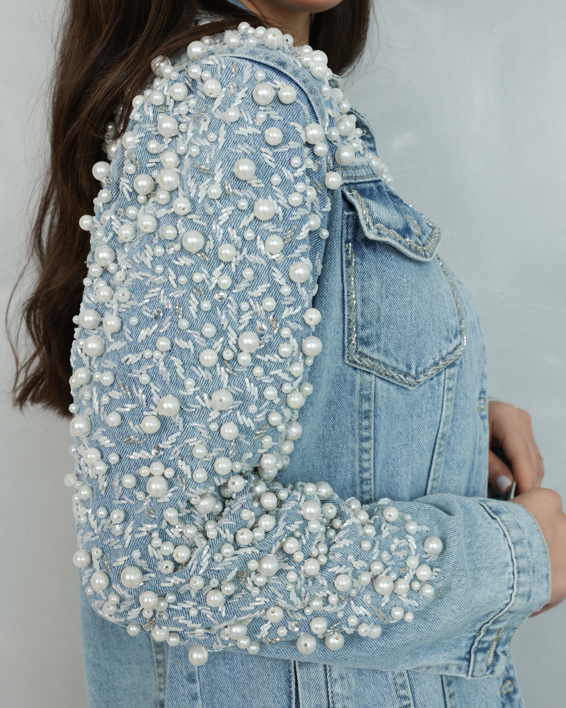 The Sugar Jacket is a delicate masterpiece, featuring intricate hand-applied pearls that create a soft and elegant texture. With its unique embellishments on the shoulders, chest, and sleeves, this light-wash denim jacket adds a touch of charm and sophistication to any outfit. Perfect for those who love timeless, feminine designs.