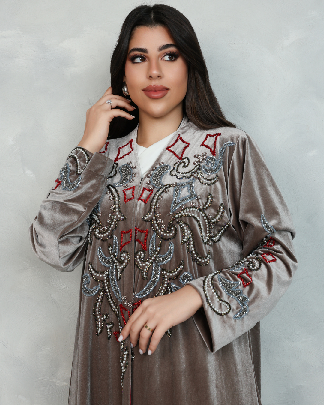 Indulge in luxury and sophistication with our Unique Velvet Abaya, a true reflection of grace and refined style. Crafted from premium velvet fabric, this abaya embodies softness, comfort, and regal charm. The intricate hand-embroidered detailing in silver and red hues enhances its exquisite appeal, making it a standout piece for any elegant occasion.